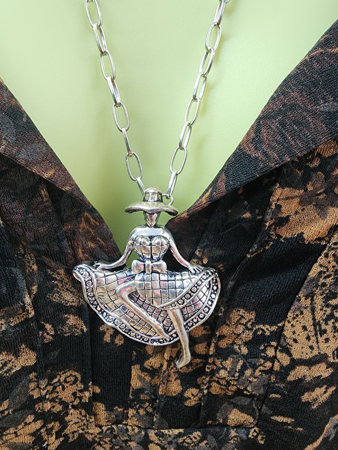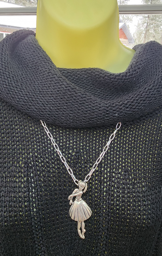 price: $9.99 . To purchase click my store link below https://www.montanaoriginalart.com/listing/1796830446/dancing-lady-necklace-large-pewter-metal