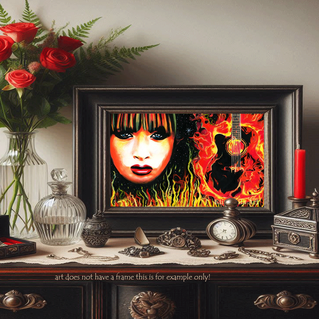 To purchase click my store link https://www.montanaoriginalart.com/listing/4347421330/flaming-guitar-art-painting-fire-womans